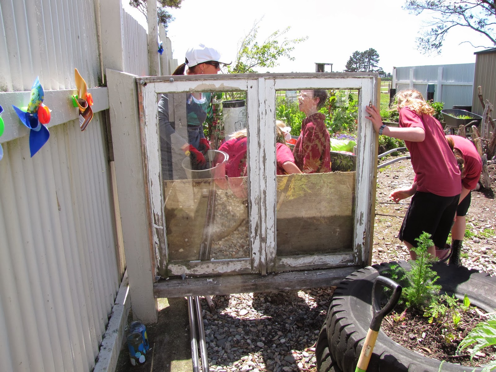 There was no shortage of willing helpers layering up the window...first some holes will drilled in the bottom sill for drainage, then a sand layer also for drainage, then a potting mix layer...